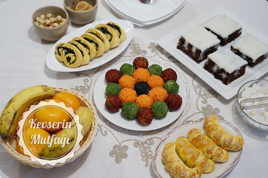Bu sefer arayı fazla açmadan yeni bir davet sofrası daha geldi. Bu sofra 4-5 kişilik bir yakın arkadaş topluluğu için yeterli olacaktır. 2 hamur işi, 1 salata, 1 tatlı var sofrada. Diyette olanlar için kuru yemiş, kuru meyveler ve taze meyvelere de yer verdim aynı zamanda. Diyetiniz konusunda ne kadar iradeli olsanız da yanınızda birileri yemek yerken hasret kaldığınız yiyecekleri elinizin tersiyle itmek zordur çünkü. Sofradaki birçok şeye göre daha masum kuru yemiş, meyve gibi yiyeceklerle el oyalamak dayanma gücünü artırır.