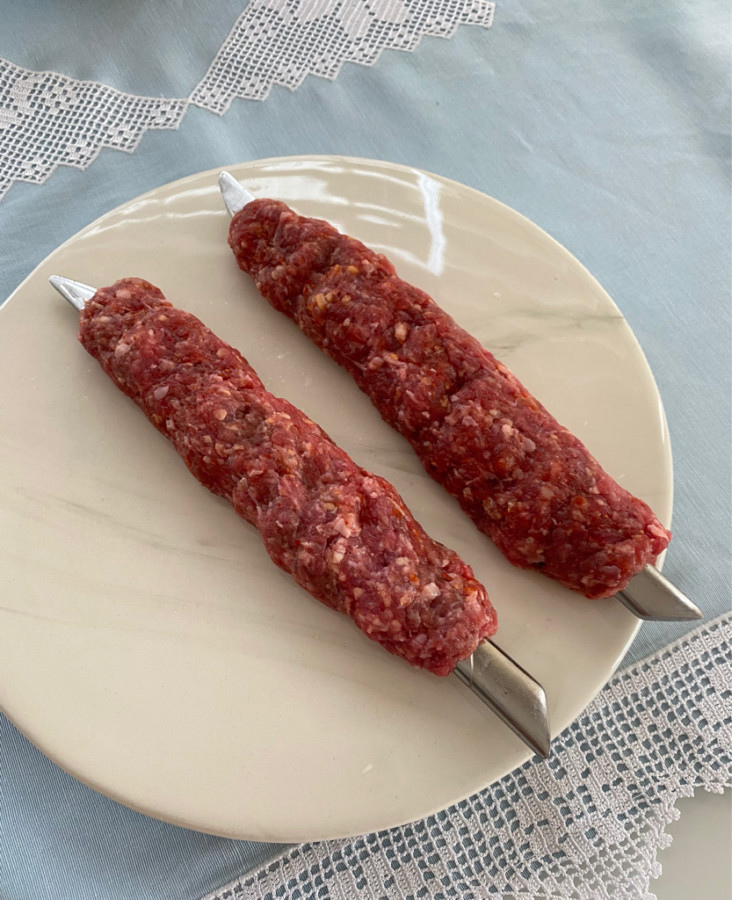 Adana şişleri internetten satın alabilir ya da benim yaptığım gibi marketlerin kasap reyonlarının önünde satılan demir şişlerden ikisini birleştirerek geniş bir şiş elde edebilirsiniz. Şişlerin demir olması içinin de iyi pişmesi için önemli. Tavada tavuk şiş tarifinde kullanılan tahta şişler aynı görevi görmez ne yazık ki.