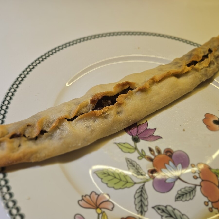 - Kıymanın altıda birini uzunlamasına hamurun üzerine yayın,
