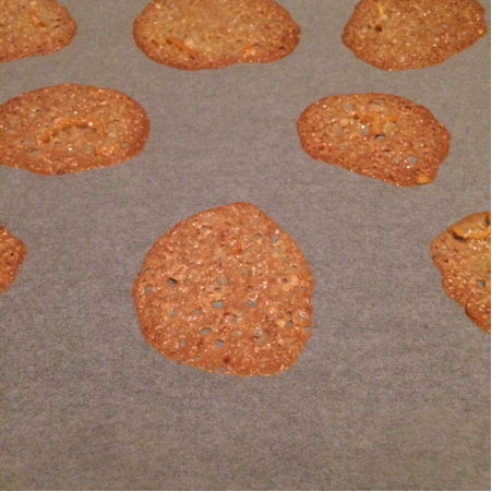 - Fırından çıkarıp (çıktıklarında hala sıvı kıvamda olacaklar) bir çay kaşığı yardımıyla kenarlarından hafifçe ortaya doğru ittirerek yuvarlak olmalarını sağlayın,