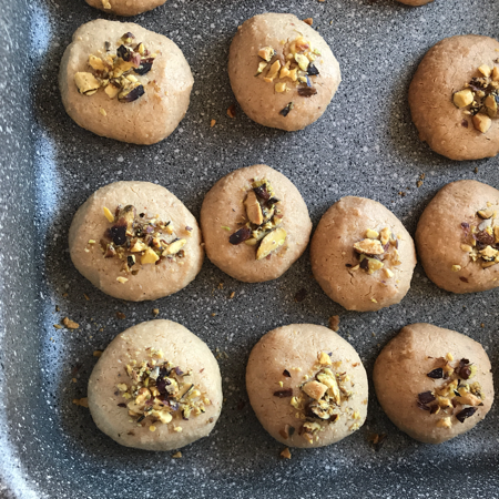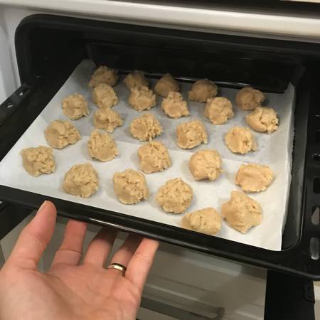 - Kurabiye şekillendiriciyle veya elinizle yuvarlayarak bir fırın kabına (yağlamanıza veya yağlı kağıt kullanmanıza gerek yok) dizin,