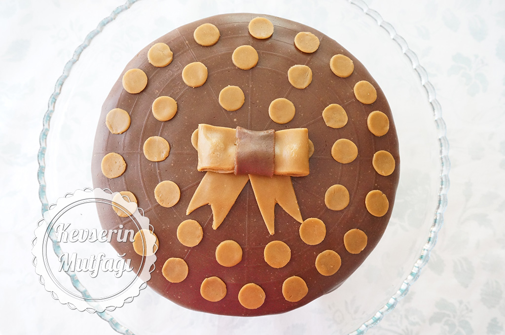- 5 cm'lik dikdörtgenlerin ucunu kurdele ucu şeklinde kesin ve pastanın ortasına koyun,