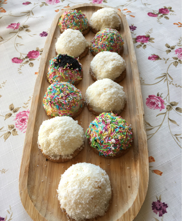 3 çeşidini de denedim; hindistan cevizli, kakaolu şekerlemeli ve renkli şekerlemeli. En başarılısı hindistan cevizlisi oldu. Bunun iki nedeni var. Birincisi şekerlemeli olanlar şekerlemenin de etkisiyle fazla şekerli oldu. İlla ki renkli olsun derseniz muhallebisini 1 yemek kaşığı şekerle veya tamamen şekersiz olarak deneyebilirsiniz. Ancak hindistin cevizli kadar iyi olmamalarının bir nedeni de şekerlemelerin muhallebinin ıslaklığıyla bir süre sonra erimeye başlamalarıydı. Yapımından 1-2 saat sonra görsel olarak da şekerden akan suların bisküviyi ıslatması sonucu yapı olarak da bozuldular. Dediğim gibi illa ki şekerlemeli olsun derseniz kısa sürede tüketilecek şekilde çok az şekerli olarak yapmanızı tavsiye ederim.