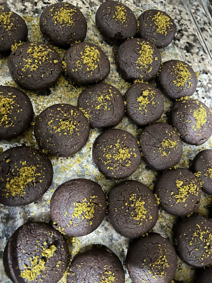 Üzeri de çekilmiş antep fıstığı ile süslenince görsel olarak da çok iyi bir sonuç ortaya çıkıyor. Antep fıstığınız yoksa hindistan cevizi veya çekilmiş fındıkla da süsleyebilirsiniz. İçine de fındık veya ceviz eklemeniz mümkün. Ama kurabiyelerin dağılmaması için çok ince çekilmiş olarak eklemenizi öneririm.