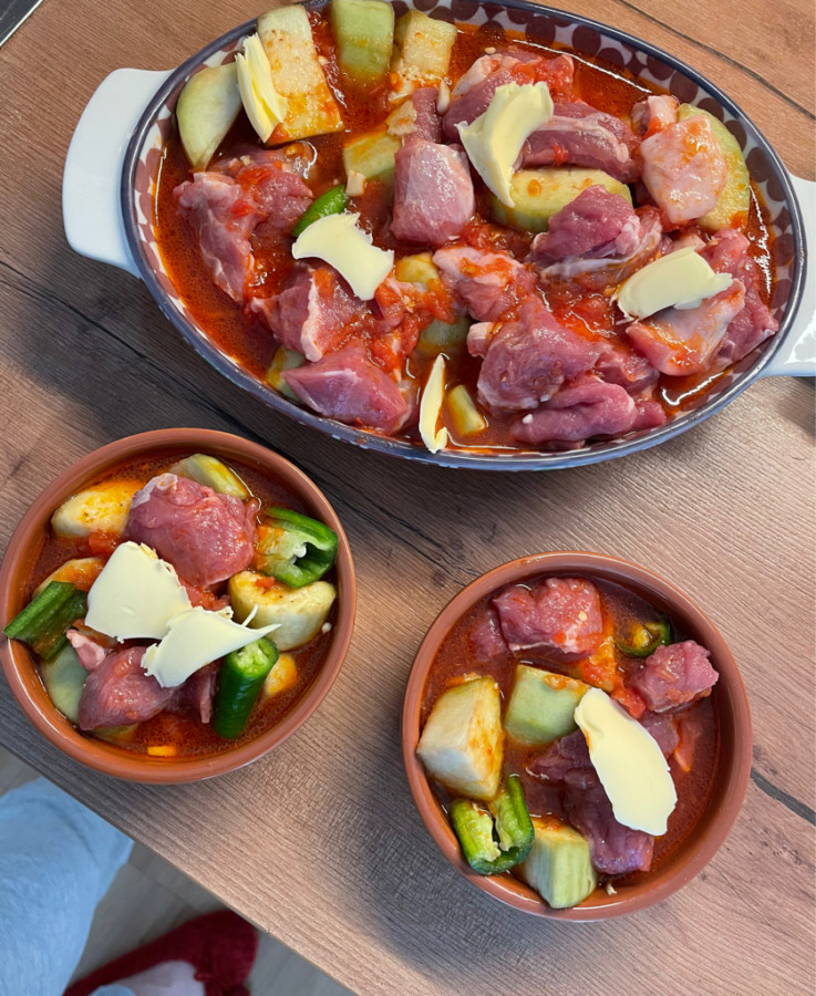 Yemeğimize dönecek olursak... Calla patlıcan, yeşil biber, soğan ve sarımsakla birlikte harmanlandıktan sonra hazırlanan salçalı ve domatesli sosla buluşturulup çok az tereyağı ilavesiyle birlikte üzeri kapalı şekilde fırınlanıyor. Etin lokum gibi pişmesi için pişme süresi uzun tutuluyor. Bu sürede patlıcanların eriyip gitmemesi için patlıcanları irice doğramanız iyi olacaktır.