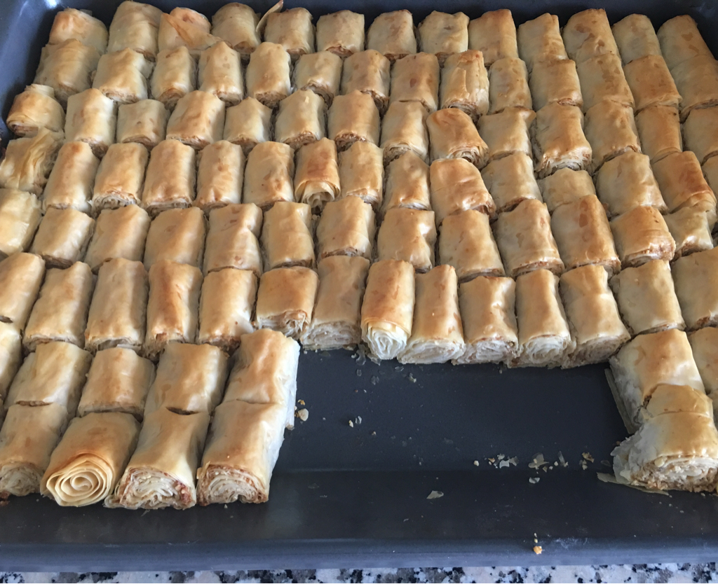 - Kalan yufkaları da aynı şekilde üçer üçer yağlayıp ortasına ceviz koyup rulo şeklinde sarın ve tepsiye dizin (aralıklı olacak şekilde),