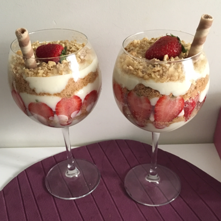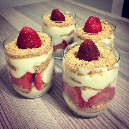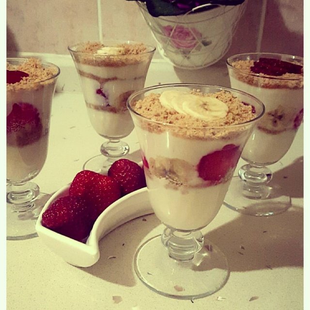 - Çilek dilimlerini servis kaplarının yan taraflarına dizin,