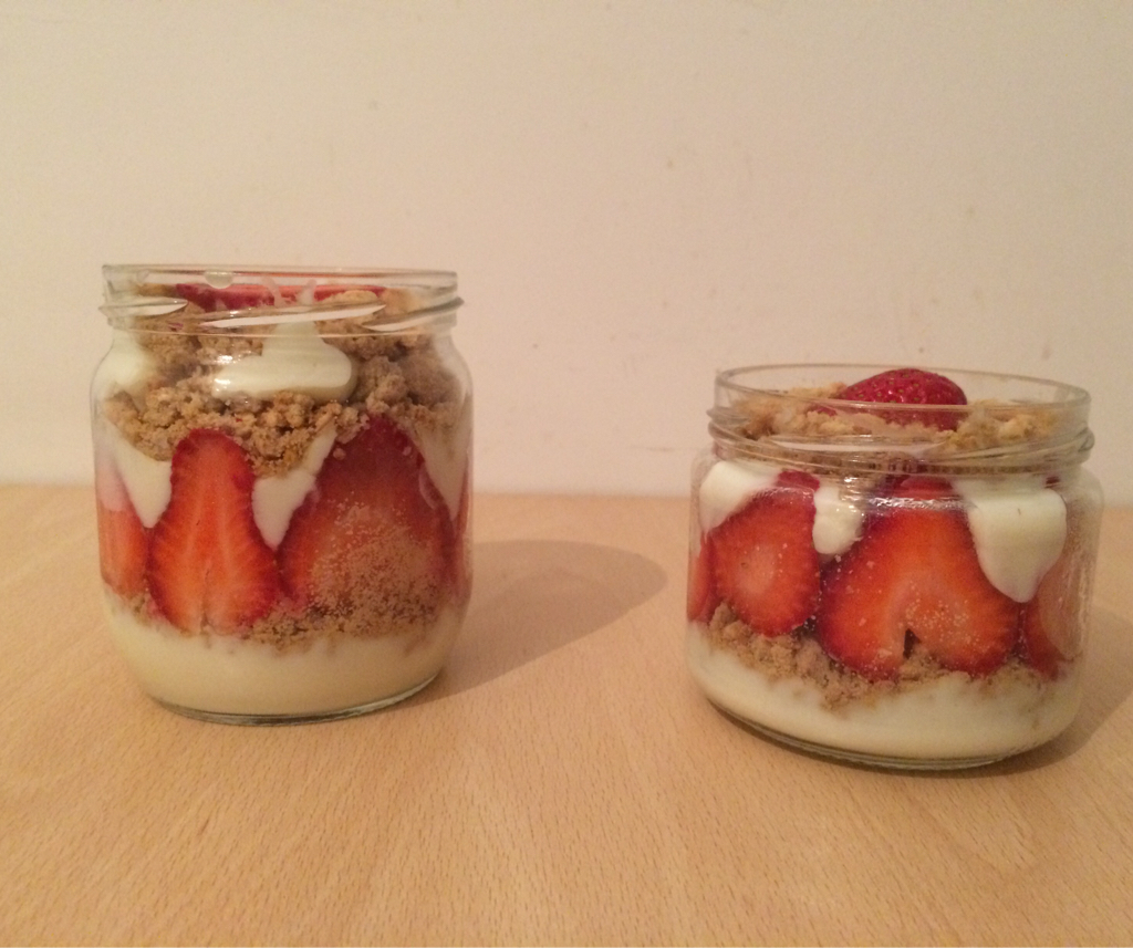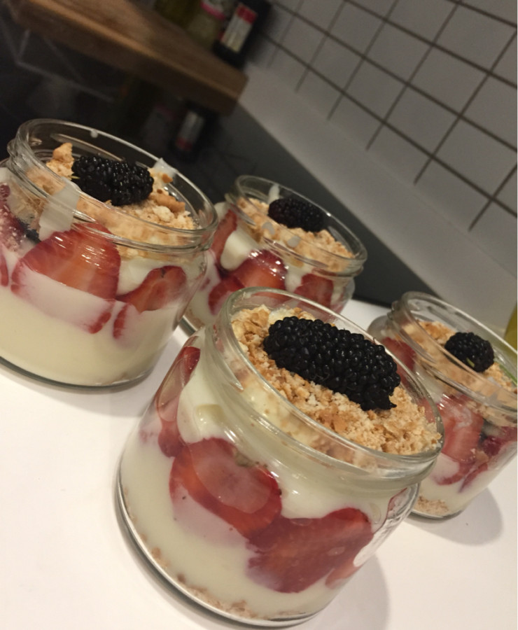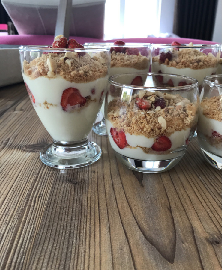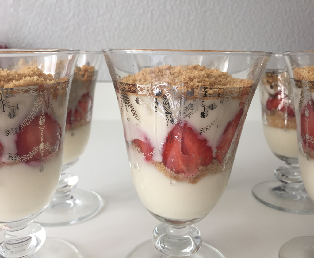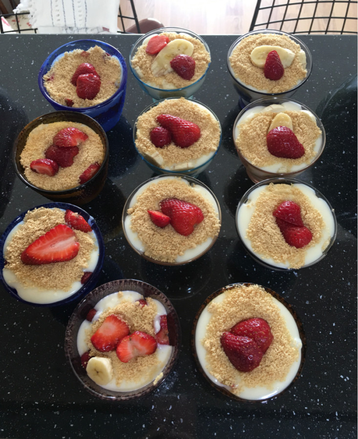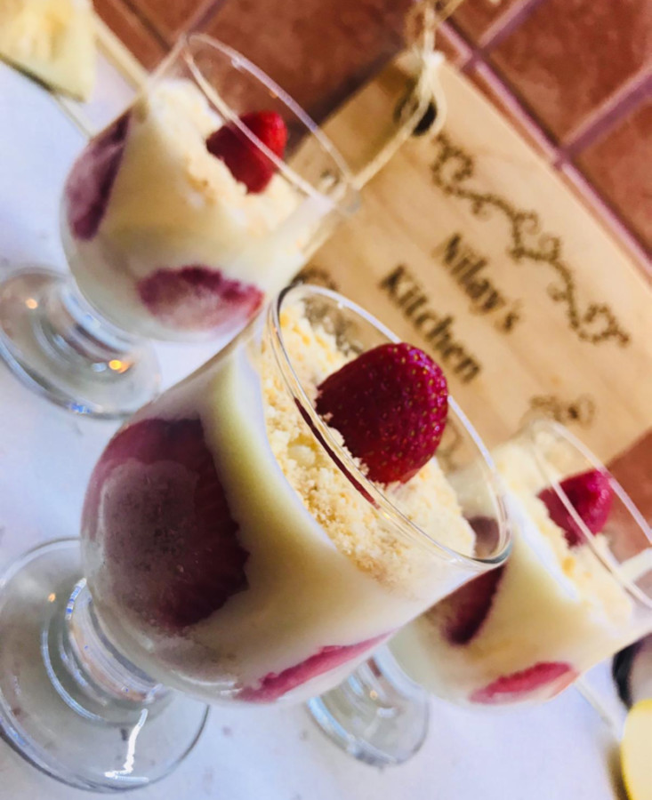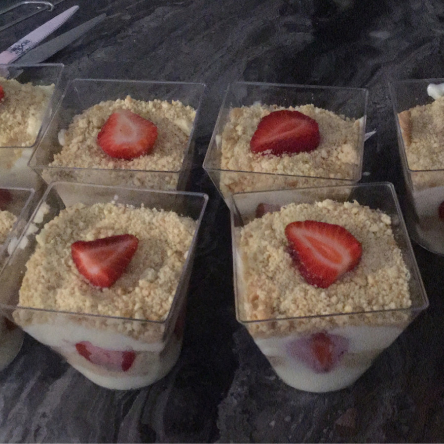 - Çilek dilimlerini servis kaplarının yan taraflarına dizin,