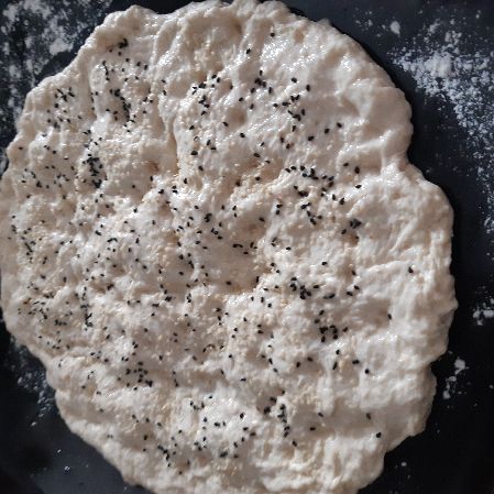 - Hamuru tepsiye alıp unladığınız ellerinizle bastırarak yuvarlak şekilde açın,