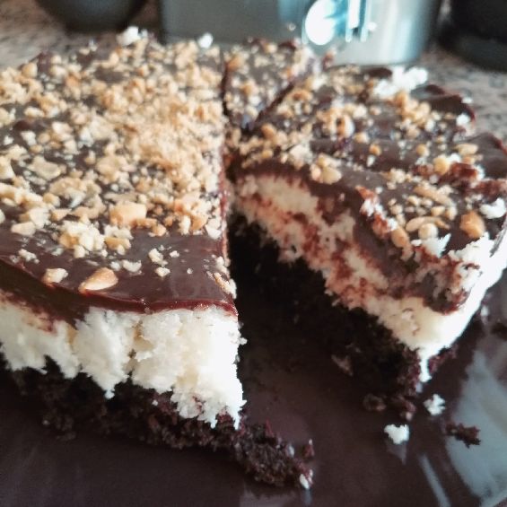 Altında ıslak dokulu, yumuşacık bir kek tabanı, arasında nefis bir hindistan cevizi katmanı ve son olarak da üstüne muazzam bir çikolata ganajı var.