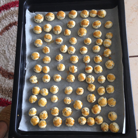 - Fındık büyüklüğünde yuvarlayarak yağlı kağıt serilmiş fırın tepsisine dizin,