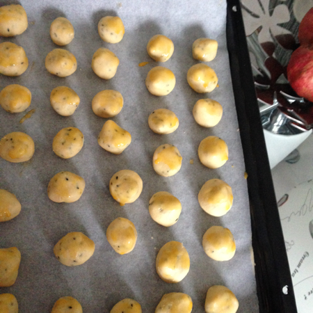 - Fındık büyüklüğünde yuvarlayarak yağlı kağıt serilmiş fırın tepsisine dizin,
