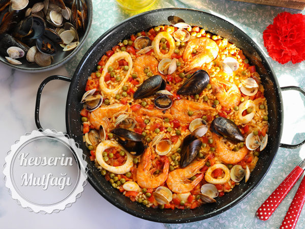 Daha önce tavuklu paella tarifi paylaşmıştım, deneyenleriniz, görenleriniz olmuştur. Deniz ürünlü paellanın hazırlanışı da çok farklı değil. Kavrulacak malzemeler kavruluyor, pirinç ve su ekleniyor, sonradan eklenecek malzemeler ekleniyor ve pişiriliyor. Deniz ürünlü paellayı farklı kılan şey hiç şüphesiz içinde deniz ürünleri kullanılması. Kullanacağınız deniz ürünlerinin neler olacağı tamamen size ve bulabildiğiniz deniz ürünlerine kalmış. Ama deniz ürünlü paellada genel olarak midye türleri, kalamar ve karides çeşitleri kullanılıyor. Bu kullanılır, bu kullanılmaz demekse mümkün değil. Paela çok fazla çeşitliliği olan bir yemek ve her yerde karşınıza çıkabilecek, herkesin evinde yaptığı paella farklı olabilir.