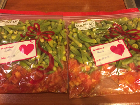Taze fasulye ve bamya gibi sebzeleri dondurucuya atmak için şoklama yani önce kaynar suda rengi değişene kadar kaynatıp ardından soğuk suyun içine bırakma yöntemini kullanmanızı öneririm. Bu şekilde kışın yemek yapmak için çıkardığınızda hem lezzet hem de renk olarak yazın pişirdiklerinizden bir farkı olmuyor. Porsiyonluk poşetlerde hazırlayıp yanlarına bir emeğe yetecek kadar da domates doğrayıp koyuyorum, böylece yemeğin domatesi de yaz domatesi olmuş oluyor. Pişirirken de Soğanı ve salçasını kavurduktan sonra donmuş haldeki bamyaları/fasulyeleri tencereye koyup üzerlerine sıcak suyunu ekliyor ve pişiriyorum.