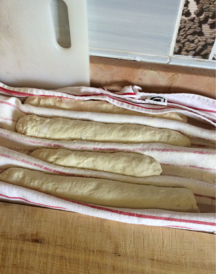 - Her bir parçayı alttan alıp üste koyarak ya da üstten çekip alta kıvırarak baget şekli verin ve unladığınız bir mutfak bezi üzerine yatırın (yayılmaması için bezin kenarlarını kıvırarak dayanak yapın) ve 2 saat dinlendirin,