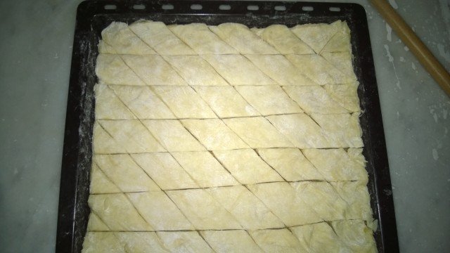 - Son yufkaları da açıp tepsinin üzerine serdikten sonra keskin bir bıçakla baklava dilimi şeklinde kesin,