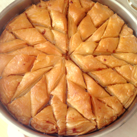 Baklavanın pişmesi oldukça uzun sürüyor. Benimki ısının kapatıldığı aşamaya kadar neredeyse 2 saat sürdü, ama sizin fırınınıza göre değişecektir bu süre muhakkak ki. Sık sık ne durumda olduğunu kontrol etmeyi ihmal etmeyin.