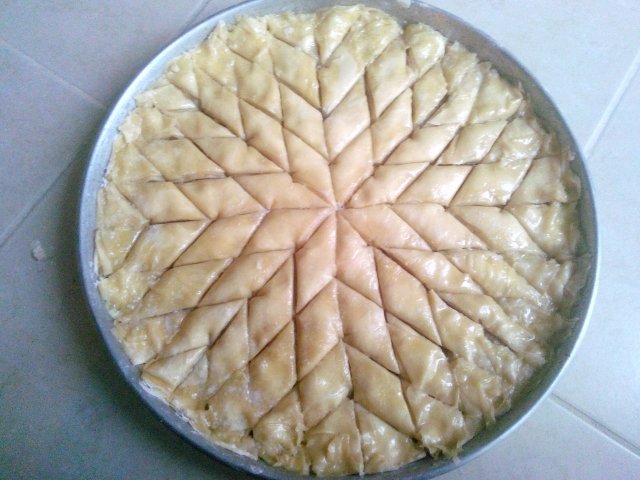 - Son yufkaları da açıp tepsinin üzerine serdikten sonra keskin bir bıçakla baklava dilimi şeklinde kesin,
