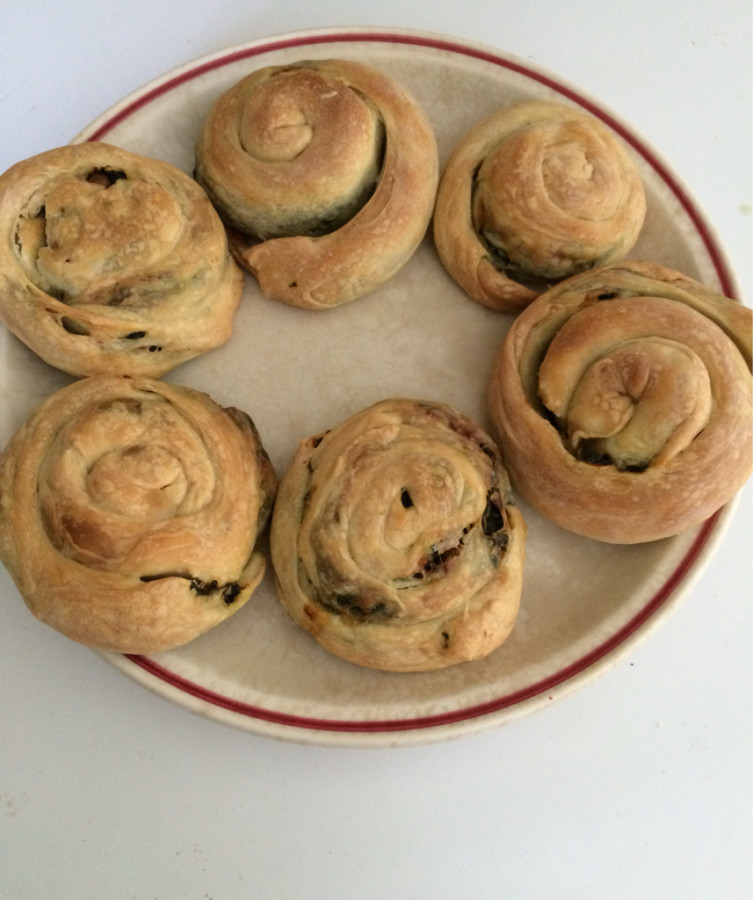 - Üç parçaya kesip her bir ruloyu kendi etrafında rulo şeklinde sarın ve yağlı kağıt serilmiş tepsiye dizin,