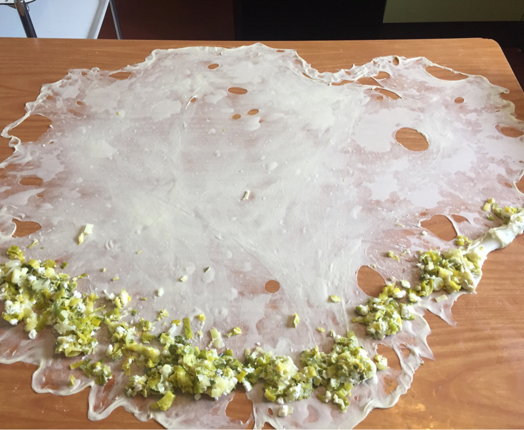 - Ispanaklı harcın beşte birini uzun kenarı boyunca ince bir şerit halinde yerleştirin ve çekip incelterek rulo şeklinde sarın,