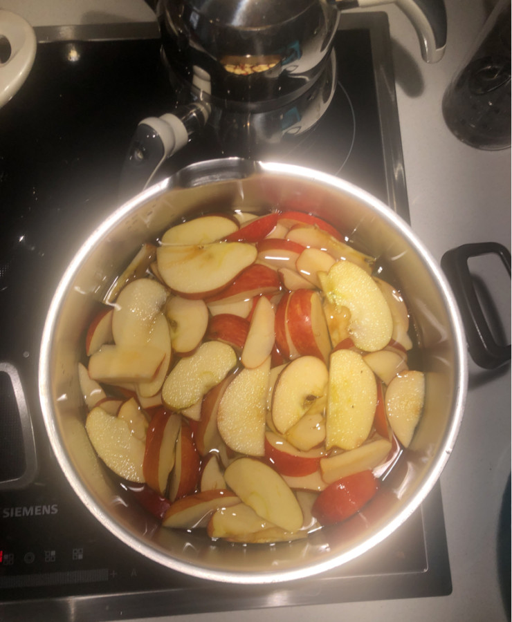 - Elmaları derin bir tencereye alıp üzerine suyu ekleyin,