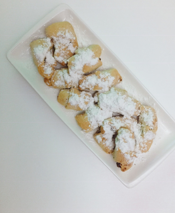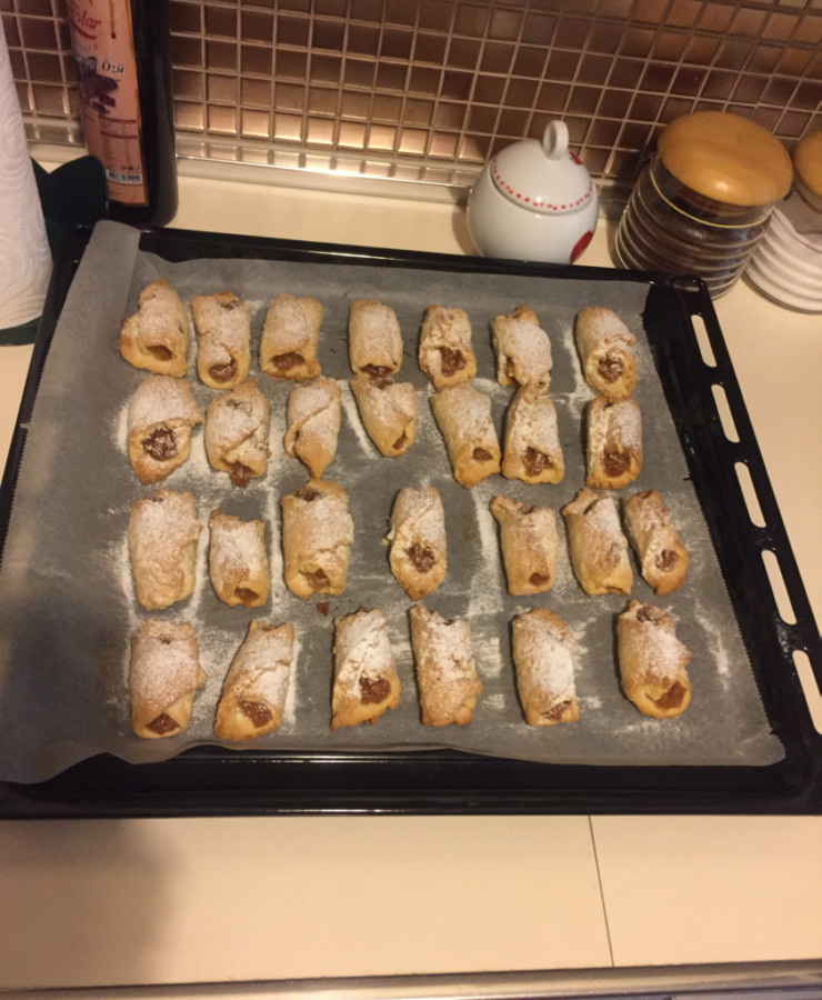 - Her bir parçanın geniş tarafında elmalı harçtan koyarak sigara böreği gibi sarın,