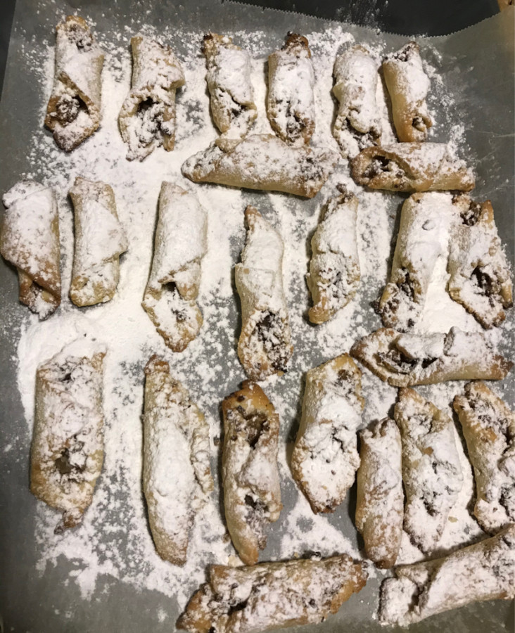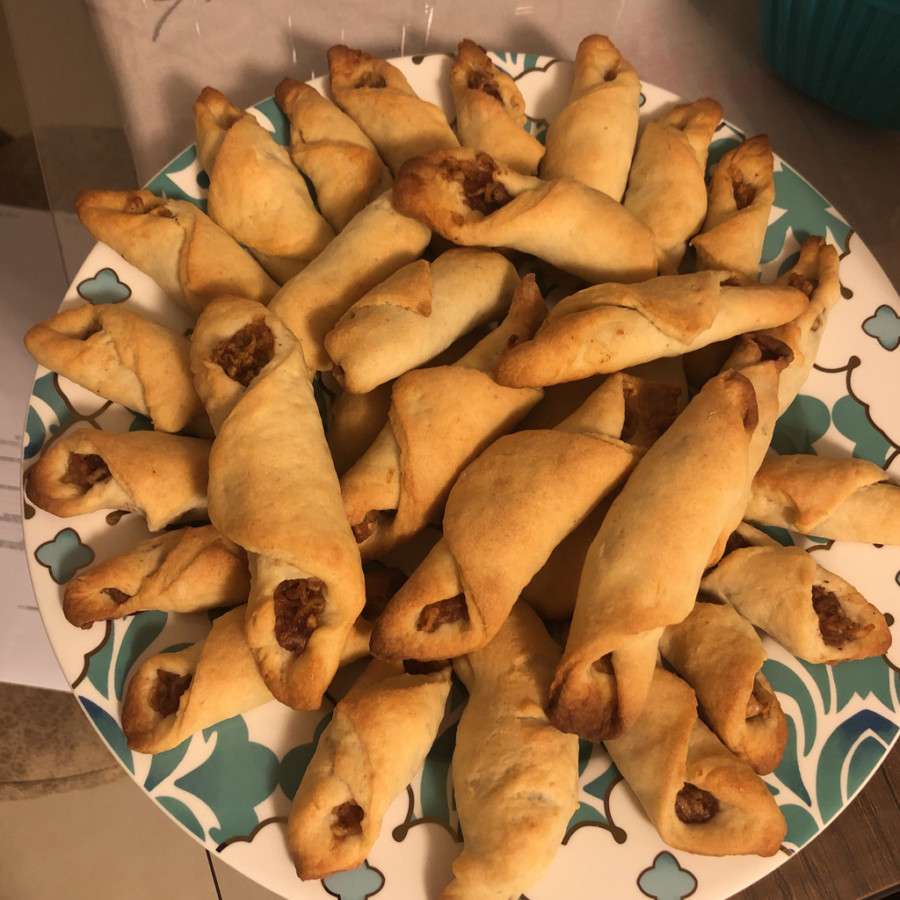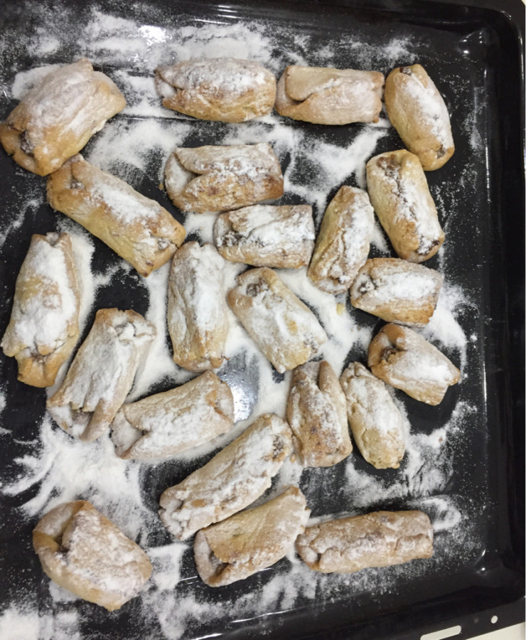 - Her bir parçanın geniş tarafında elmalı harçtan koyarak sigara böreği gibi sarın,