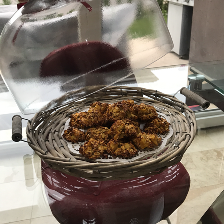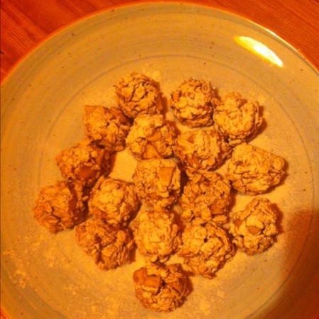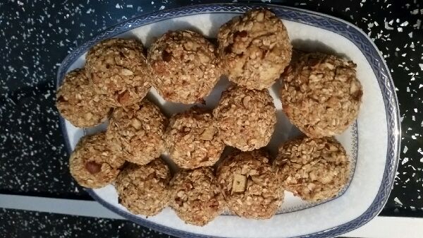 Çok konuştum, tarife sıra gelmedi bir türlü. Tarifle ilgili iki şey söyleyeceğim. Adındaki "kurabiye" kelimesi sizi ağızda dağılan kıyır kıyır bir hamur işi beklentisine sokmasın. İçinde un olmayan hiçbir şeyden böyle bir sonuç beklemeyin. Daha da genişleteyim hatta; daha önce yemediğiniz, ilk defa denediğiniz şeylerde kafanızda bir kıvam yaratıp onun olmasını beklemeyin, hayal kırıklığına uğrarsınız. Bu kurabiye dışı sert, içi hafif ıslak bir kıvamda oluyor. Yine "kurabiye" kelimesine istinaden elinizde yuvarlayabileceğiniz bir hamur elde etmeyi beklemeyin. Tarifte de belirttiğim gibi elinizle sıkarak top yapın, başka türlü toparlanmaz zaten. Kar topu yapıyorsunuz gibi düşünün şekillendirirken.