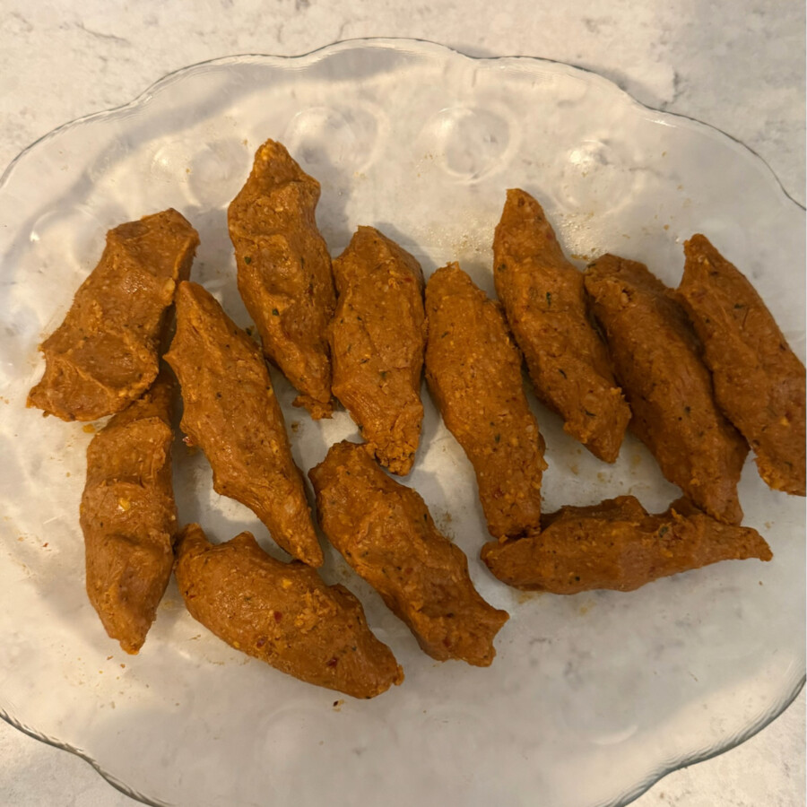 - Tüm karışımı blenderdan veya mutfak robotundan (ben blender kullandım) geçirip elinizle çiğ köfte şeklinde sıkın ve servis tabağına dizin,