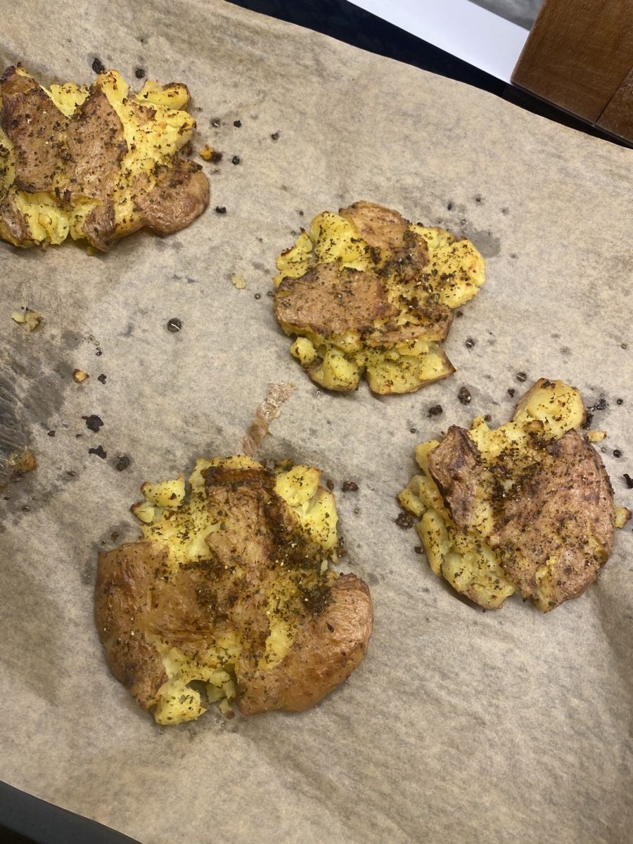 Et, tavuk, balık yemeklerinin en güzel garnitürüdür patates. Salatası olur, püresi olur nasıl yaparsanız öyle olur ama her türlüsü güzel olur. Bu da Amerikalıların "smashed potatoes" dedikleri bir garnitür.  Çok basit bir hazırlanışı olması ve inanılmaz lezzetli oluşunun yanı sıra çok eğlenceli bir görüntüye sahip. Daha da iyisi bunu hazırlarken her bir patatesi sevmediğiniz birinin yerine koyup istediğiniz kadar ezebilirsiniz. Yanlış anlamayın cani falan değilim sadece modern çağın getirdiği stresle başa çıkmak  için modern yöntemler geliştirmeye çalışıyorum kendi çapımda.