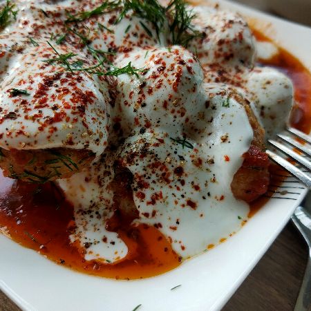 - Köfteleri servis tabaklarına paylaştırıp üzerlerine sarımsaklı yoğurt gezdirin, kıyılmış maydanoz ve pul biber serpin