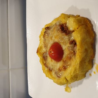 Patates dolmalarımız kıyma kavurma ve patates püresinden oluşuyor. Sadece kavrulmuş kıymayı pürenin içine sakladım. Ne olduğunu bilmeden yiyenler için hoş bir sürpriz oluyor. Kullandığınız kıyma da lezzetli bir kıymaysa eğer lezzetine doyum olmuyor.