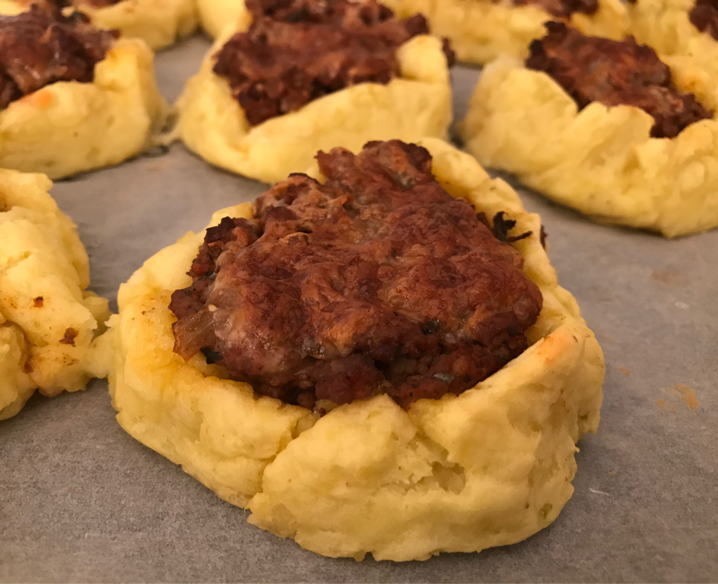 Patates dolmalarımız kıyma kavurma ve patates püresinden oluşuyor. Sadece kavrulmuş kıymayı pürenin içine sakladım. Ne olduğunu bilmeden yiyenler için hoş bir sürpriz oluyor. Kullandığınız kıyma da lezzetli bir kıymaysa eğer lezzetine doyum olmuyor.