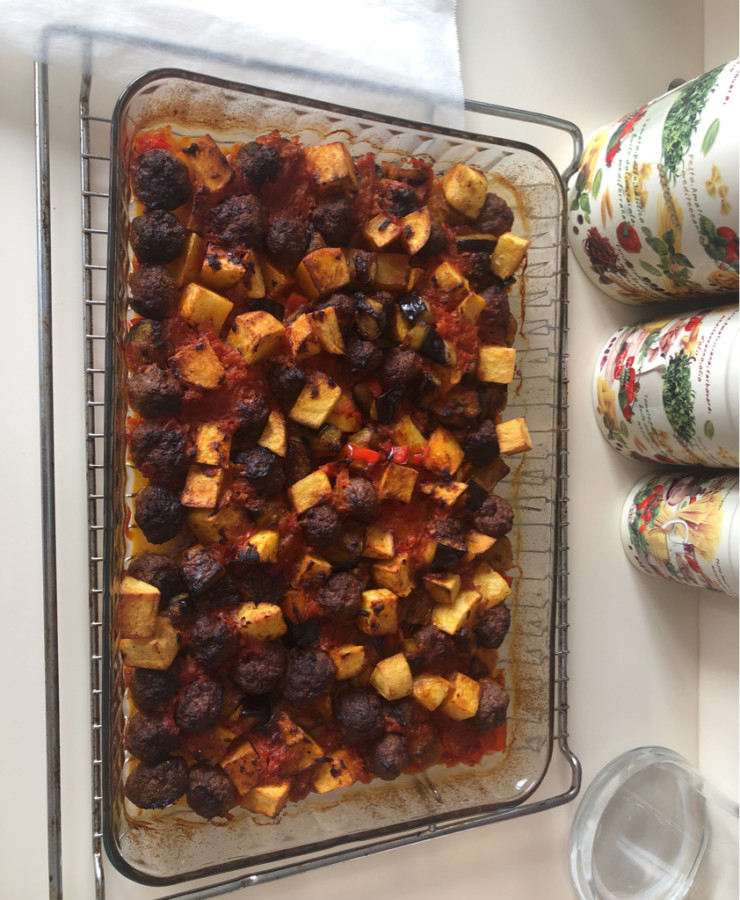 Közleyip babagannuş, ali nazik, hünkar beğendi, patlıcan çorbası, kızartıp musakka, zeytinyağlı patlıcan yemeği, karnıyarık, çiğden ratatouille, patlıcan dolması... İlk aklıma gelenler bunlar. İsimlerini anınca bile ağzım sulandı. Bu yemekte de mutfağımızın vazgeçilmezi köfteyle bir araya getirdim patlıcanı. Kızarmış kırmızı biber ve nefis bir domates sos da girince işin içine, efsane bir yemek çıktı ortaya.