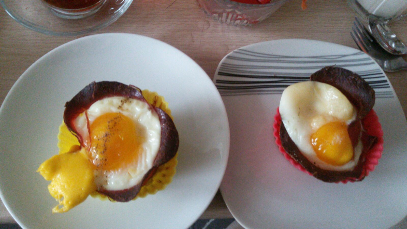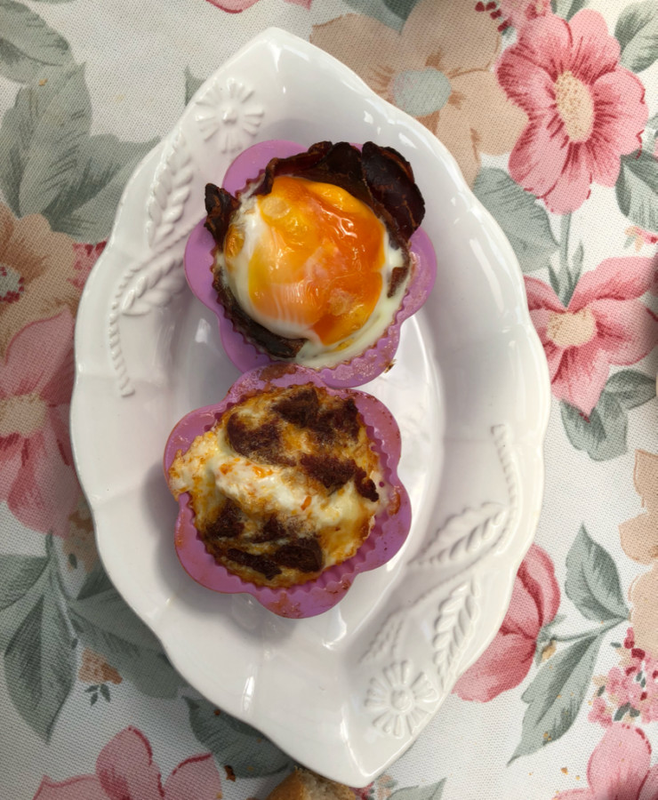 Küçük muffin kalıplarına sepet örer gibi yerleştirdiğiniz pastırmanın ortasına yumurtayı kırıp fırına veriyorsunuz. Pastırmanın yağı akıp kalıbını yağladığı için ekstra yağ kullanmanıza gerek yok. Sadece üzerine damak zevkinize göre tuz ve dilerseniz karabiber serpebilirsiniz. Pişme süresini de yumurtayı nasıl sevdiğinize göre ayarlayın. Ben beyazını pişmiş, sarısını az pişmiş sevdiğim için beyaz kısmın şeffaflığı gidip bembeyaz olduğu anda çıkarıyorum fırından.