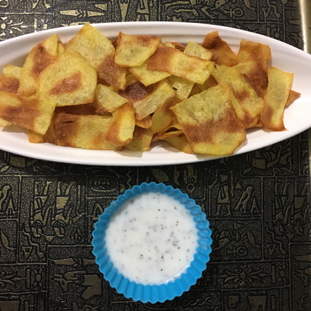 Patatesleri özellikle çok büyük kullanmayın. Sebze soyma aparatı ile büyük patatesleri düzgün bir şekilde dilimleyemezsiniz. Ben baharat olarak yalnızca toz biber kullandım. Ekleme ya da çıkarmalar yapmak size kalmış. 2 adet patates fırın tepsisine tam geliyor patatesler birbirine değmeyecek şekilde. 2 kişi için de ideal porsiyonda oluyor bana göre. Sıcakken servis etmenizi öneriyorum. Soğuyunca bazıları kıtırlığını kaybedip elastikleşiyor hafiften. Fotoğrafta cipslerin yanında gördüğünüz sos yoğurt+kuru nane.