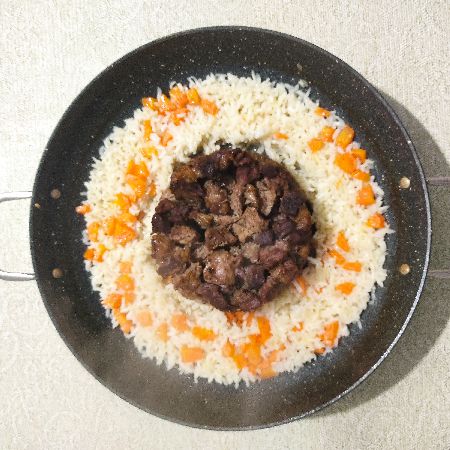 İlk etapta eti tepsinin içine kapattıktan sonra tepsiye 5 su bardağı su ekliyoruz (sıcak veya soğuk olabilir çok önemi yok). 50 dakika sonunda pilavı hazırlamaya başlıyoruz. Yaklaşık 10 dakika da o sürüyor. Yani toplam 60 dakika (1 saat) sonunda tepsiyi fırından çıkarıyoruz. Bu sürede ilk etapta eklemiş olduğumuz 5 su bardağı su buharlaştığı için azalmış oluyor. Benimki 1 su bardağı kadar kalmıştı. Burada göz kararınızı kullanın, sakın suyu boşaltıp ölçmeye kalkmayın. Hem tasın içindeki et dökülebilir, hem de sıcak olduğu için elinizi kolunuzu yakabilirsiniz et dökülmesin diye uğraşırken.