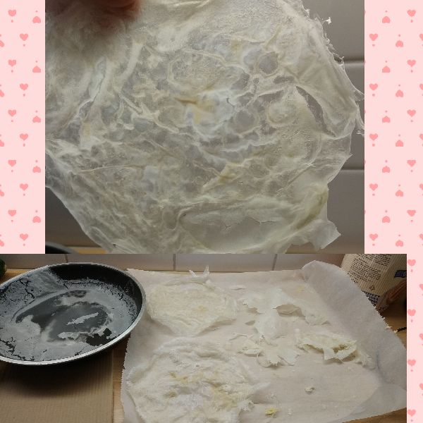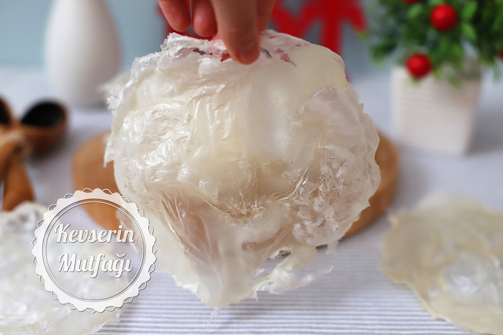 - Ocağa alıp en yüksek ısıda üzerinden yelpaze vb bir şey sallayıp üzerini de havayla kurutarak güllaç yaprağı tavadan ayrılana kadar pişirin,