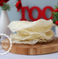 Bu arada eğer yaprakları hemen kullanacaksanız fırında kurutmanıza gerek yok. Sadece tamamını pişirene kadar birbirlerine yapışmayacak şekilde ayrı ayrı dizerek bekletmeniz gerekiyor. Tavada pişmiş halleri en ince yerleri kıtır, birazcık kalın yerleri ise bir gün beklemiş krep gibi oluyor. Fotoğraflarda elde etmeniz gereken kıvam anlaşılıyor zaten. İlk birkaç tanesini yaptıktan sonra anlarsınız ne kadar dökmeniz gerektiğini. Gereğinden fazla döktüğünüz takdirde bir tatlı kaşığıyla fazlasını alabilirsiniz, kıvamı buna müsaade ediyor (tava kızgın olup hemen pişmediği takdirde elbette).