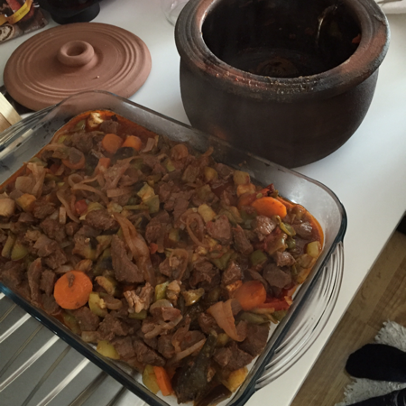 Tarifi ben porselen fırın tenceresinde pişirdim. Güveciniz varsa güveçte, dilerseniz benim gibi fırın tenceresinde, hiçbiri yoksa da derin bir cam tepside pişirebilirsiniz. Kabınızın kapağı yoksa yemeğe temas etmeyecek şekilde yağlı kağıtla hava almayacak şekilde kapatabilirsiniz.