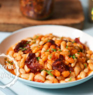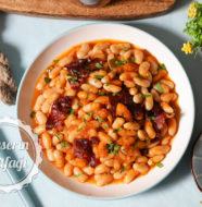 9. Kapağını kapatıp (veya üzerine yağlı kağıt ve onun üzerine alüminyum folyo örtüp) 200 derecede önceden ısıtılmış fırında 1,5 saat pişirin (fasulyeleri kontrol edin, çok diriyseler biraz daha pişirebilirsiniz),