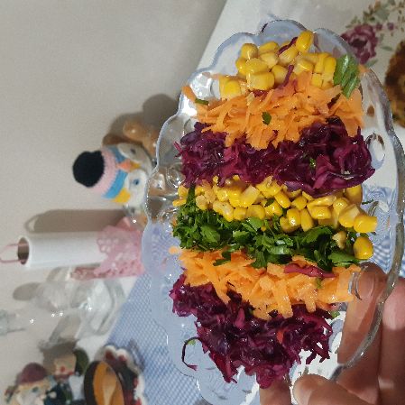 - Servis tabağına bir sıra havuç, bir sıra mor lahana, bir sıra mısır, bir sıra maydanoz olacak şekilde dizin,