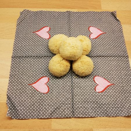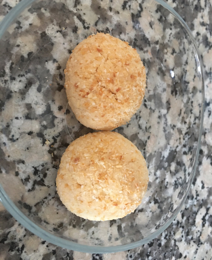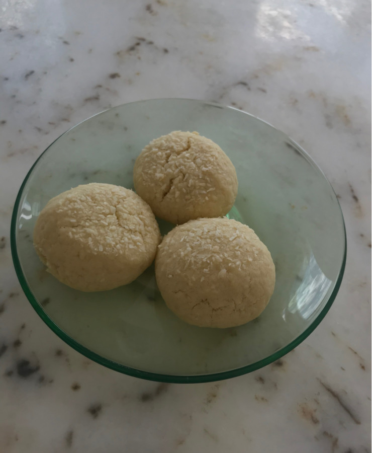 - Hamurdan cevizden küçük parçalar alıp yuvarlayın ve kenara ayırdığınız hindistan cevizine bulayın,