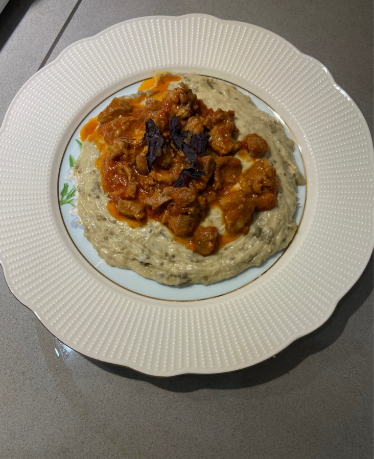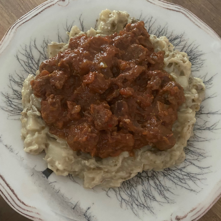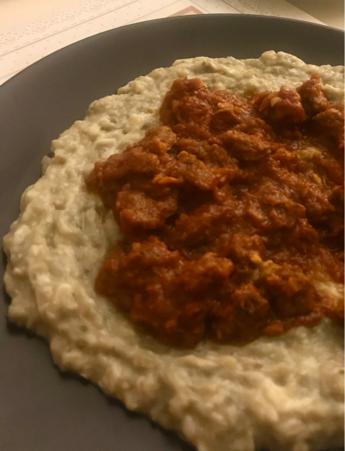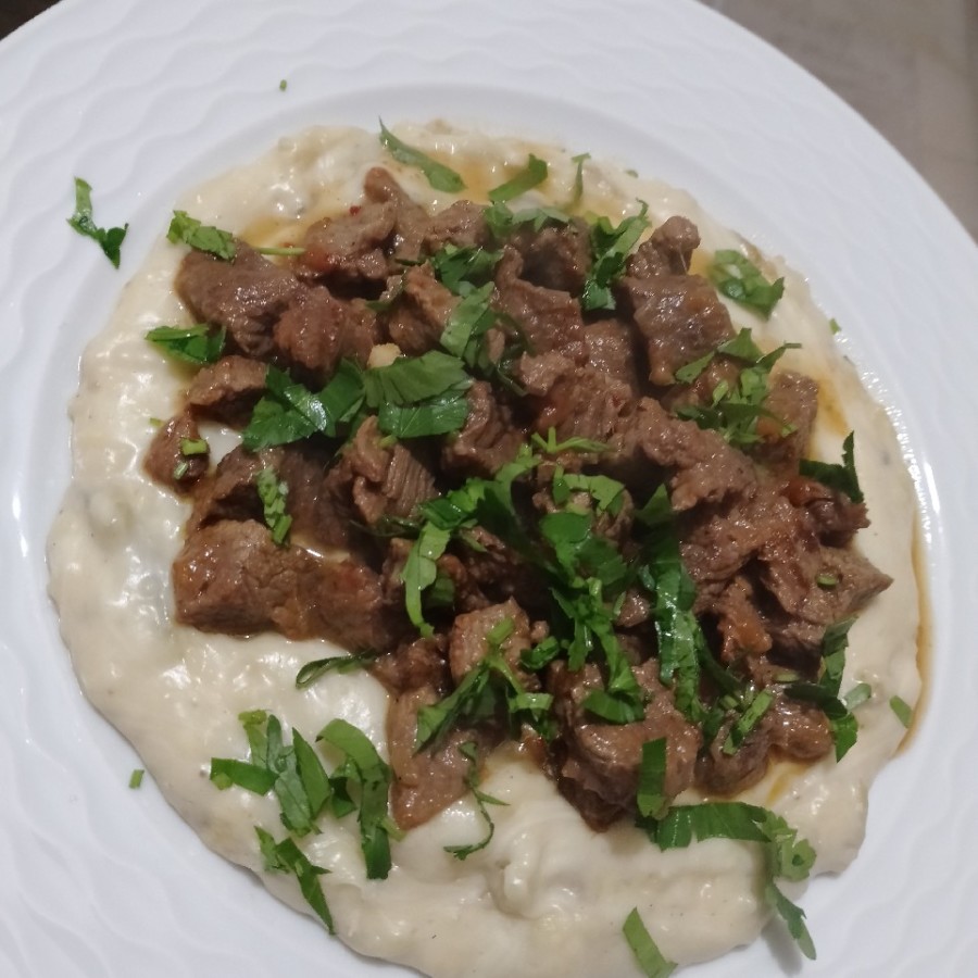 - Servis tabağınıza önce patlıcanlı karışımı, üzerine de soslu etinizi koyarak sıcak servis yapın.