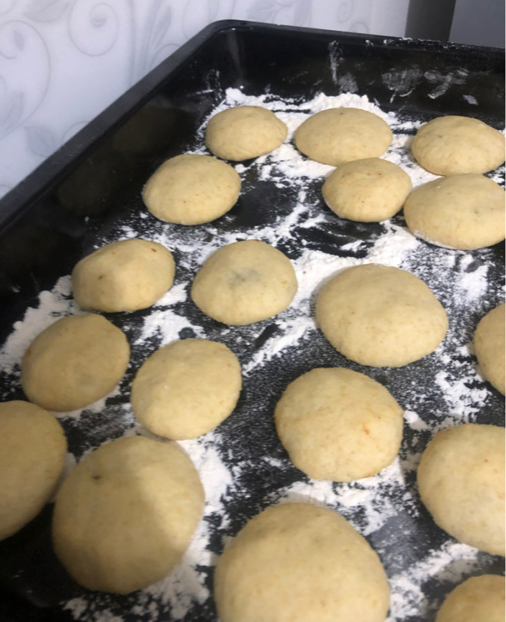 - Dış harçtan mandalinadan küçük toplar koparıp yuvarlayın ve baş parmağınız ile ortasını delip olabildiğince geniş bir boşluk oluşturun,