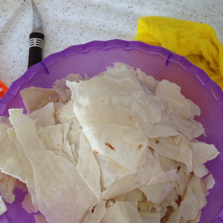 - Küçük parçalara böldüğünüz yufkaları ekleyip harmanlayın,