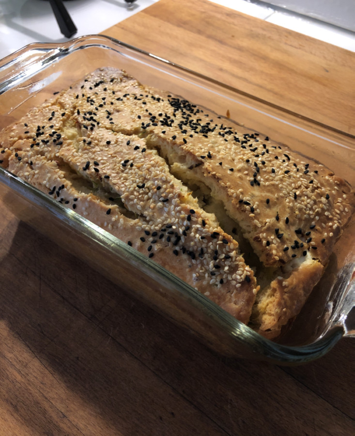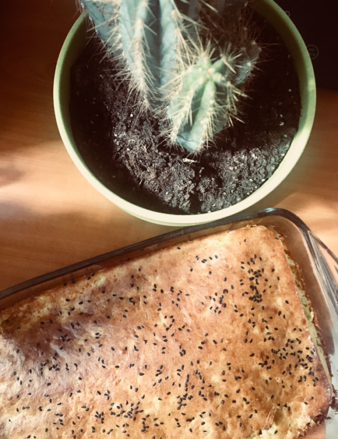 - Yağlamış olduğunuz 26*12 cm'lik baton kalıba döküp üzerine susam serpin,