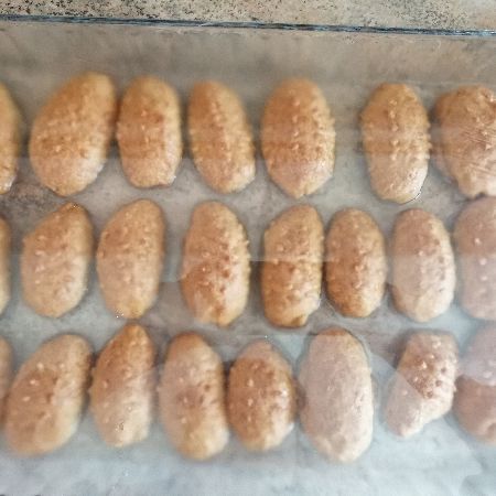 - Uygun boyutlu bir fırın kabına dizip (yağlı kağıt sermenize gerek yok) 180 derecede önceden ısıtılmış fırında kızarana kadar pişirin,
