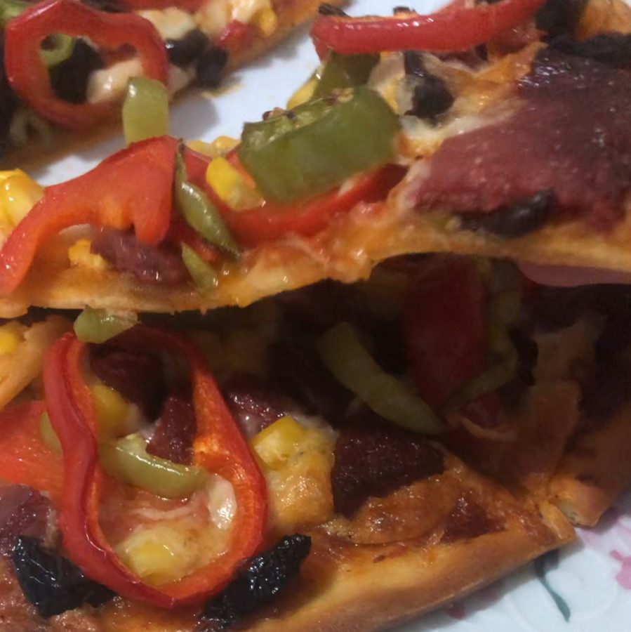 - Sırasıyla kaşarı, sucuğu, mantarları, biberleri, mısırı ve zeytini pizzanın üzerine yayın,