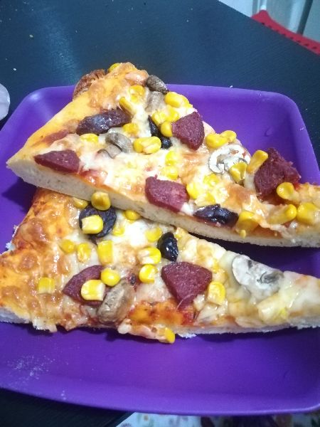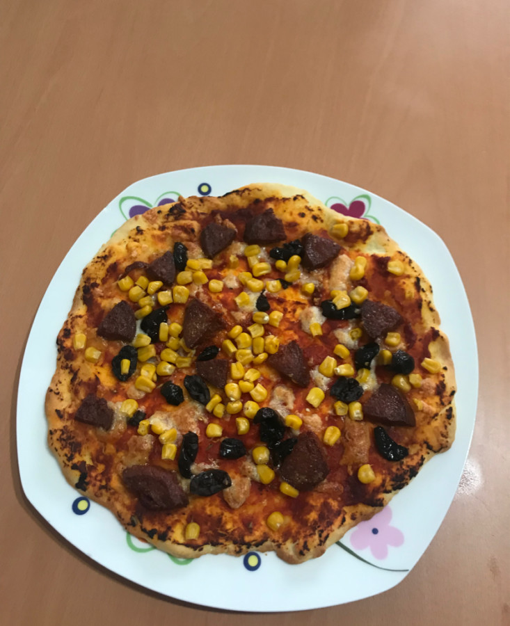 - Sırasıyla kaşarı, sucuğu, mantarları, biberleri, mısırı ve zeytini pizzanın üzerine yayın,